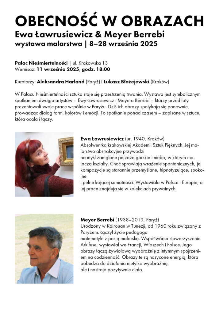 1. godz. 16.00 – budynek na ul. Kopernika 15, wystawa „Tożsamość idei Struktury Powiązań Konfiguracje” – oprowadzanie kuratorskie Anny Śliwińskiej,